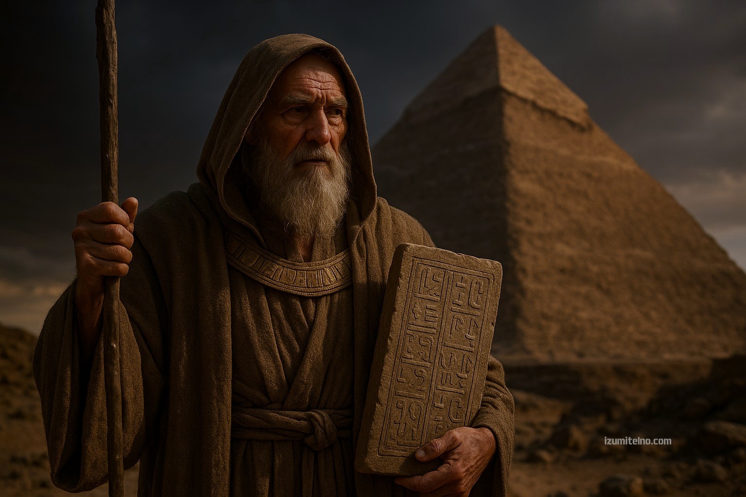 Връщайки се към Пирамидата, арабските изследователи приписват египетските пирамиди и храмове на ЕПОХА ПРЕДИ ПОТОПА, пише Алан Ф. Алфорд в книгата си: „Пирамида на тайните – Архитектурата на Хеопсовата пирамида, преосмислена в светлината на Митологията на Сътворението”. Освен това, авторът отбелязва Едно популярно предание, заимствано от Коптската и Херметическата традиция, твърди че строителят на Пирамидите и Храмовете е бил „първият Хермес” или „Хермес на Хермесите”, известен още като Хермес Трисмегист заради трите си качества на пророк, цар, и мъдрец.